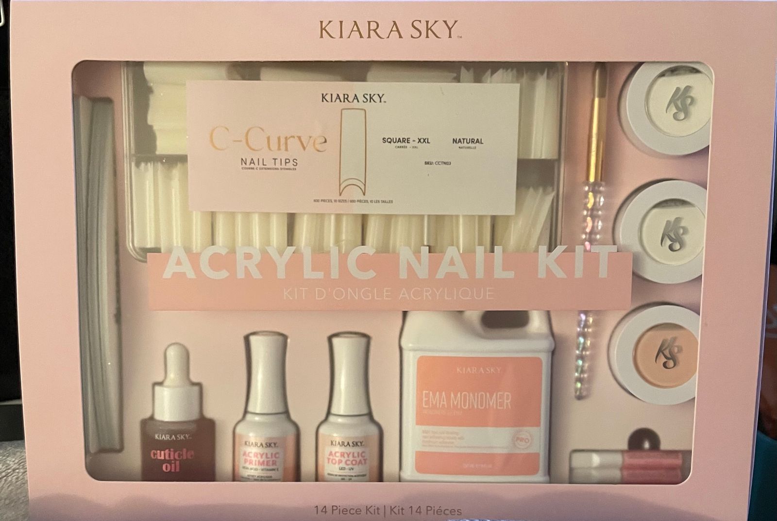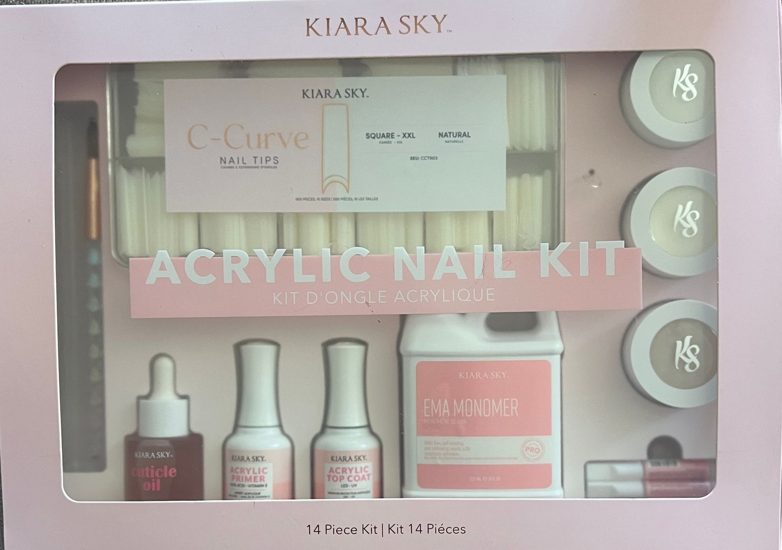 Everything you love about Kiara Sky's acrylic system and accessories, All-in-One kit! Achieve the sets you've been aiming for with our best-selling EMA Monomer, handcrafted crystal-cut acrylic brush, and 3 shades of our self-leveling flawless finish All-in-One powder. Designed by our Kiara Sky Educators, this acrylic kit hits every wish on a nail pro's list including a full case of our C-Curve Nail Tips + Glue and full-size bottles of Acrylic Primer and Top Coat Essentials. But what about Files and Cuticle Oil? We got you! That's included too! The holy grail of acrylic kits is here!